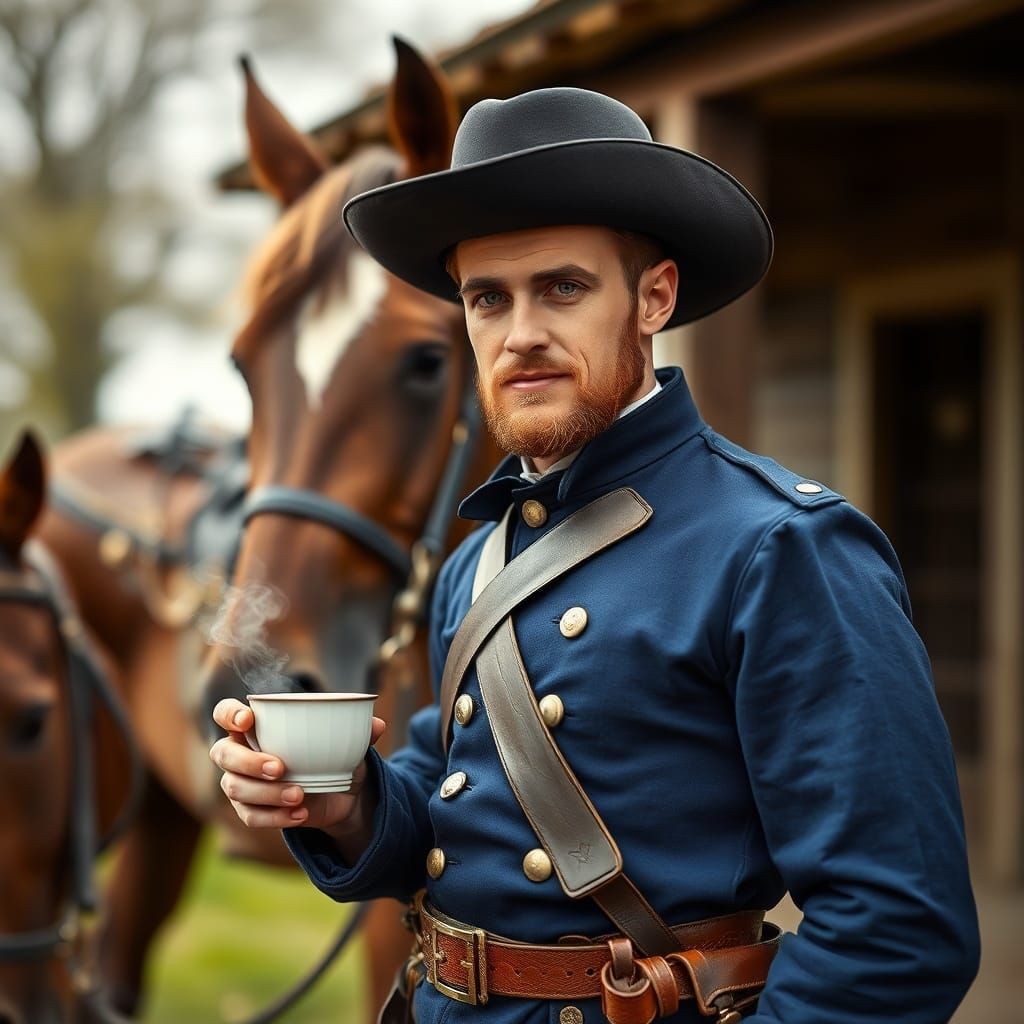 A studio-quality panoramic photo from 1865 shows a Union cavalryman with his horse at his family farm. His mother offers him tea. Ultra-high-resolution with incredible detail.