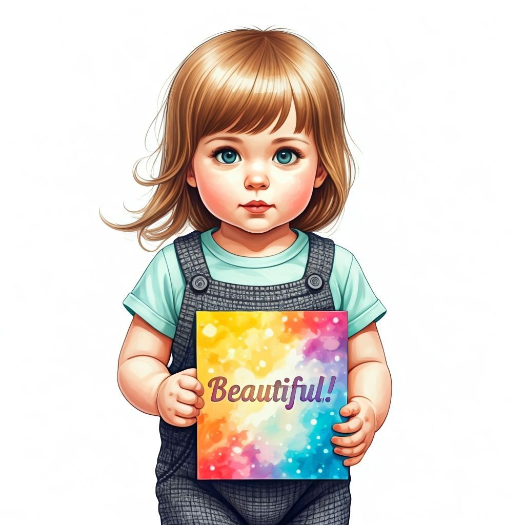 A charming watercolor image of a baby girl standing and holding a colorful page. The toddler, with flowing hair and bangs, wears a knitted jumpsuit and short-sleeved shirt in this delightful scene.