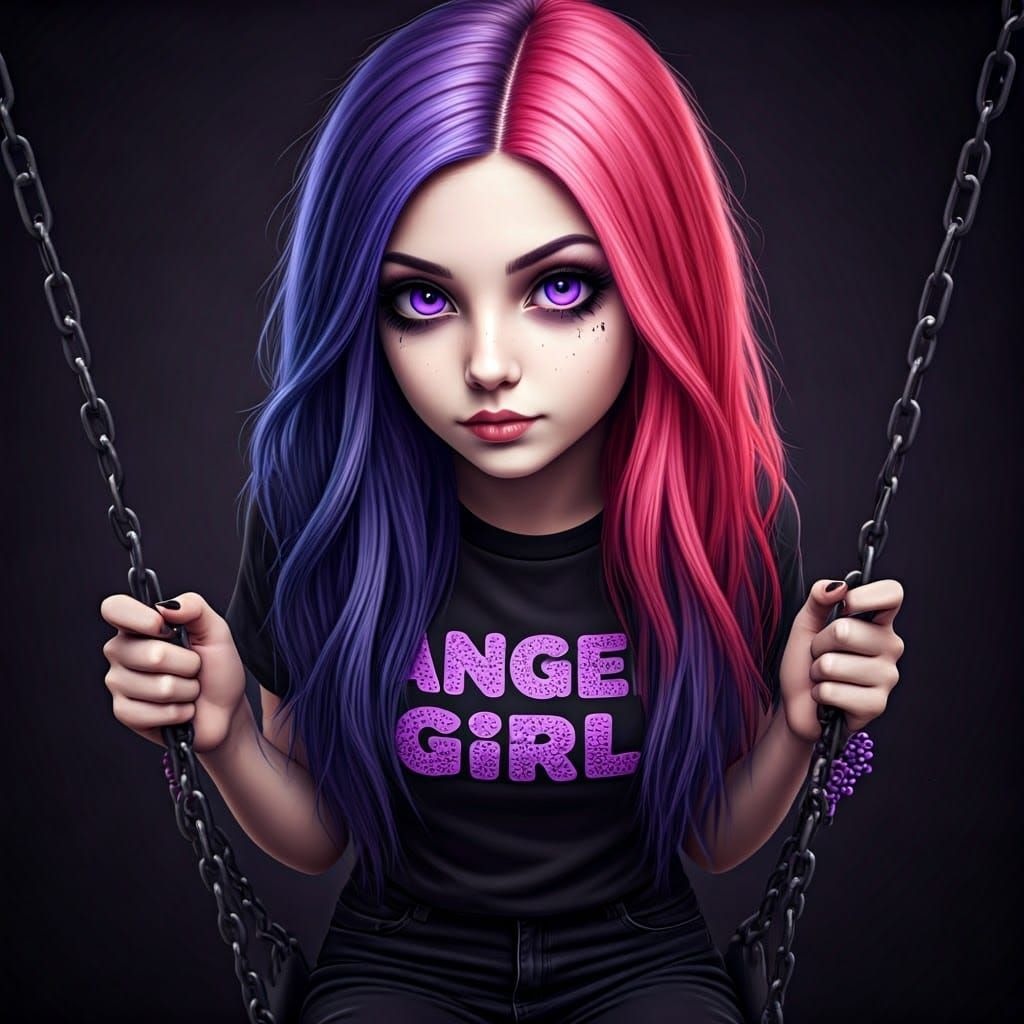 A close-up portrait of a young woman with striking violet eyes and vibrant, ombre hair, set against a soft background, capturing her essence in a professional, yet hauntingly beautiful image.