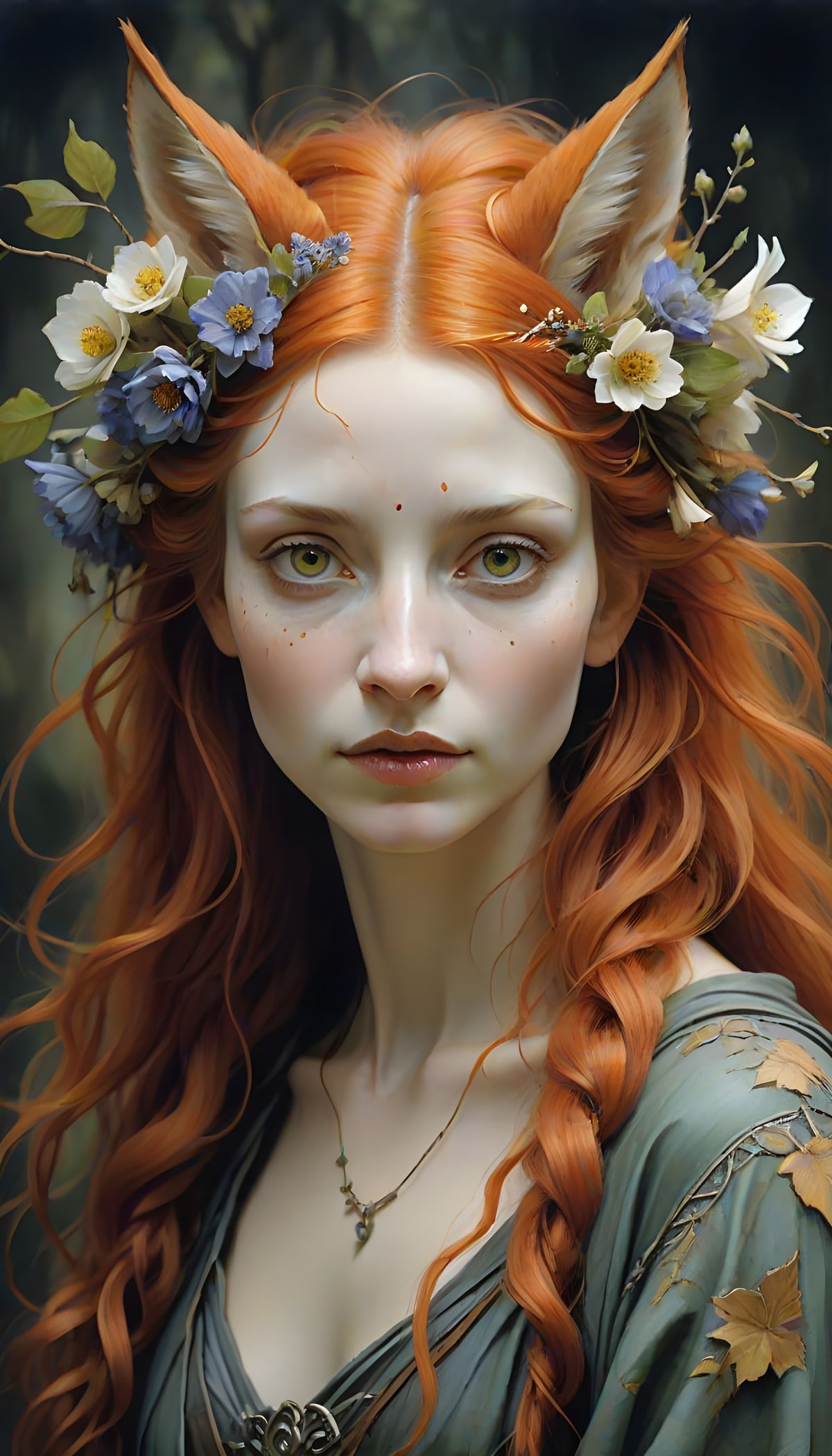 This image shows a mystical, ethereal woman with fox-like features, surrounded by a vibrant, dreamlike forest. Her fiery red hair and orange-colored flowers blend seamlessly with her surroundings, creating a captivating visual harmony.