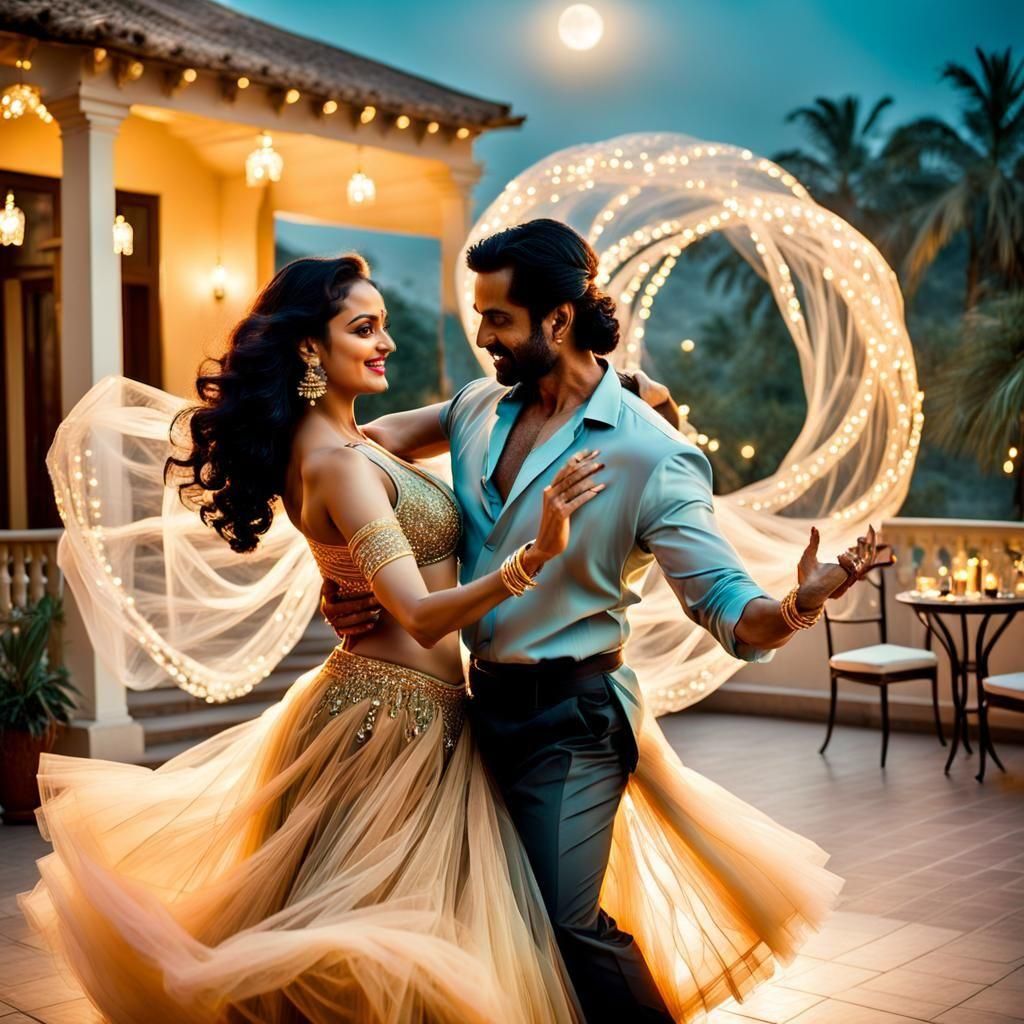 "Shwetha Menon wearing a tulle bikini is dancing with her husband on her terrace"