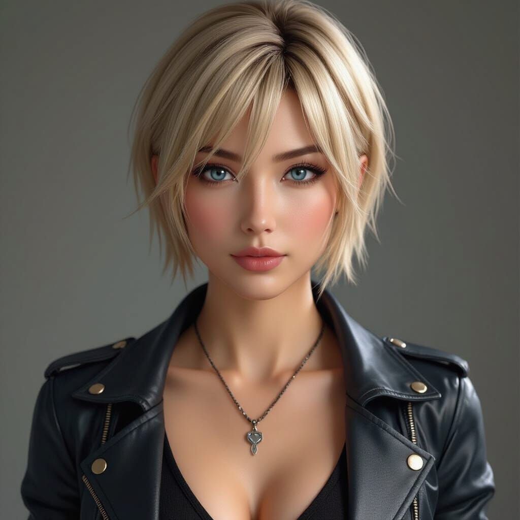 This image shows a realistic digital portrait of Aya Brea, a tall, beautiful Asian woman with short blonde hair and piercing blue eyes, in a black mini skirt and jeans jacket.