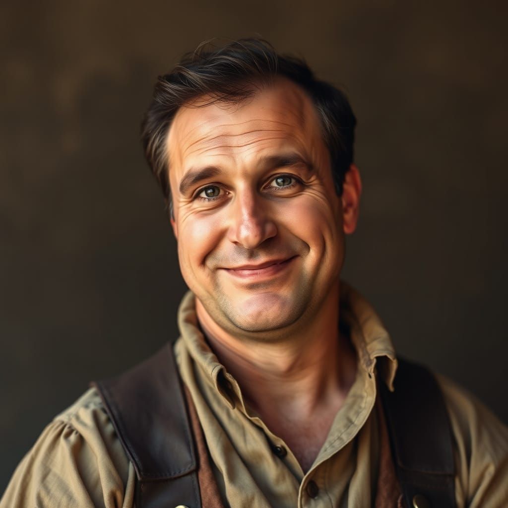 This image shows a middle-aged man with a receding hairline, dressed in Regency-era peasant clothing. His kind smile and gentle eyes evoke the rustic charm of classical portraiture.