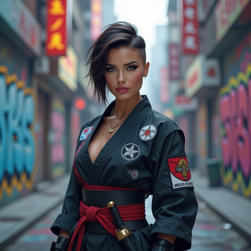 This image showcases a strong woman in ninja attire with a distinctive short haircut, set against a lively city background filled with graffiti. Presented with high contrast and energetic, colorful textures.