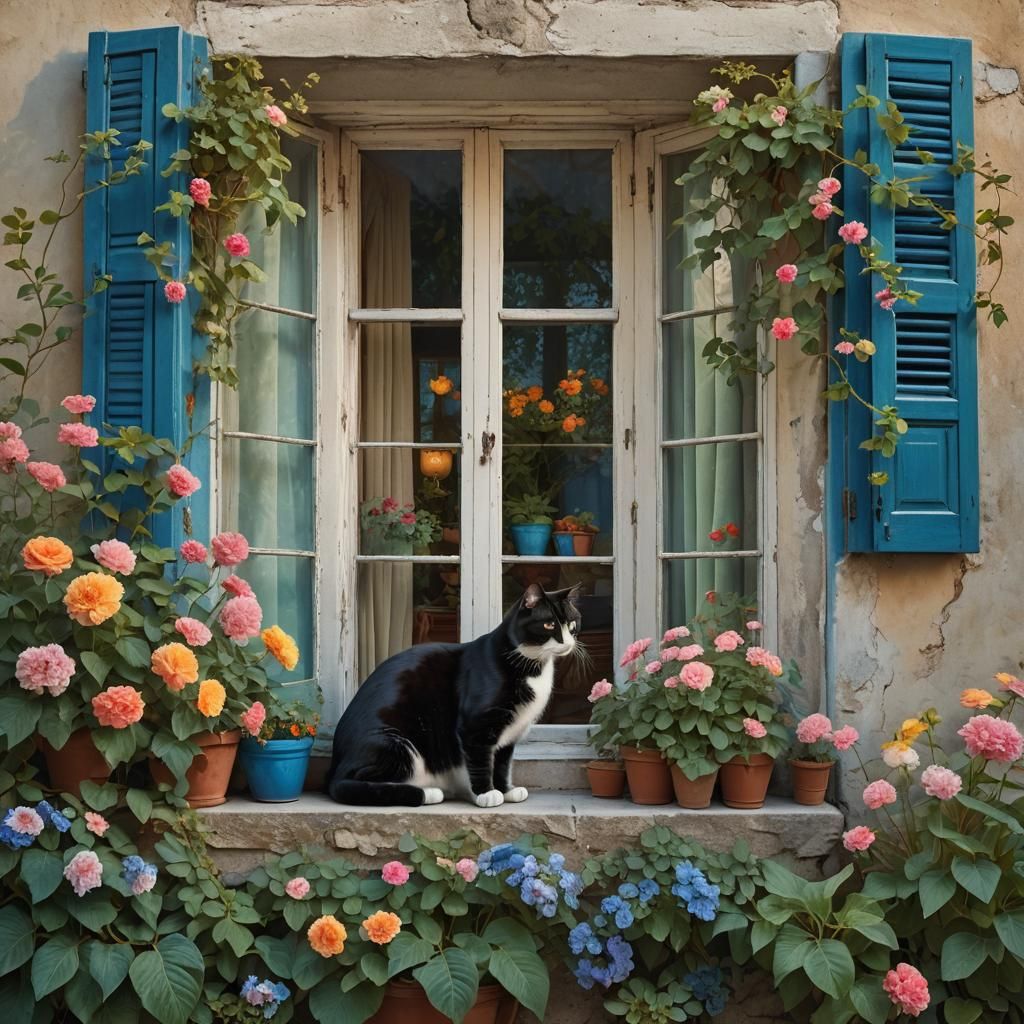 A sun-drenched Italian window with blue blinds frames a summer scene. A cat watches from within, surrounded by flowers. Soft lighting and warm shadows evoke a vintage aesthetic.