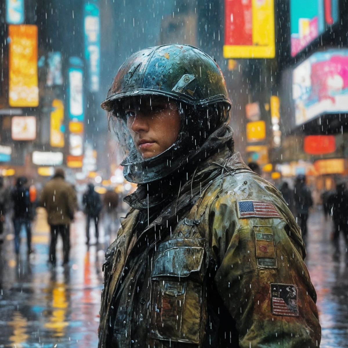 This image shows an arc soldier in Times Square during a rainy night. The artwork features thick impasto oil painting techniques with vibrant, melting neon cyberpunk colors and streaking raindrops.