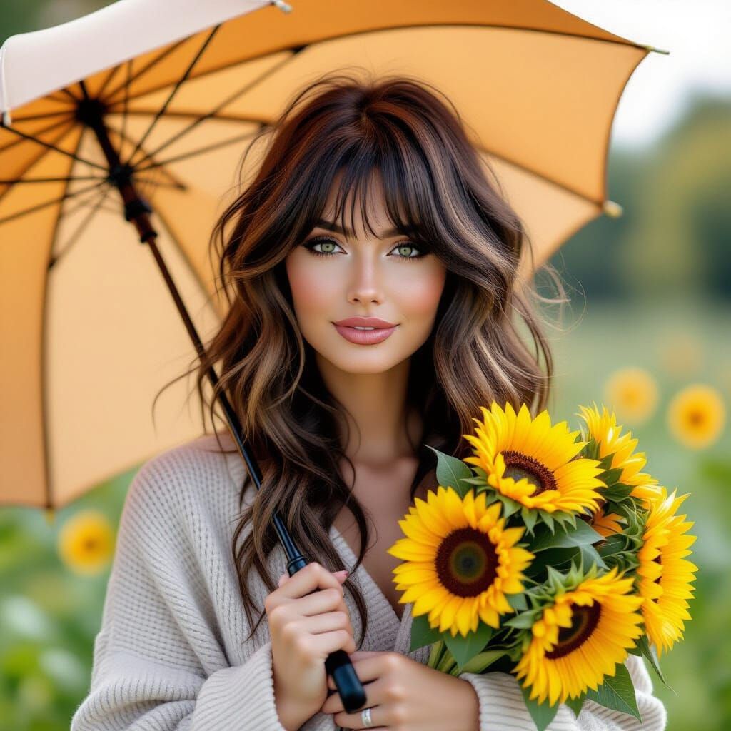A stunning, full-body portrait of a beautiful woman standing and holding sunflowers. Rendered with vivid colors in a diamond painting style for exceptional quality.