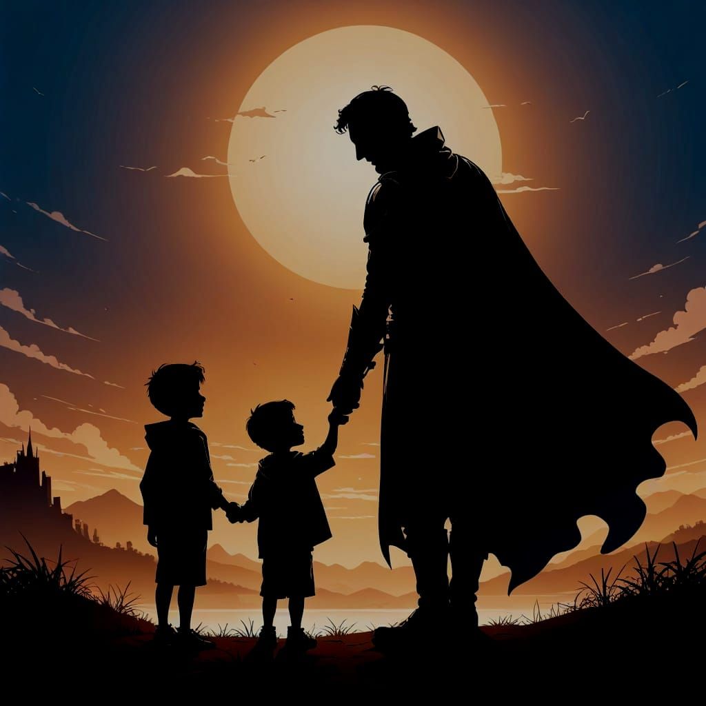 This image shows a silhouetted man with a cape shaking hands with two boys in a gradient vector landscape. The digital art style emphasizes clean lines and vibrant color transitions.