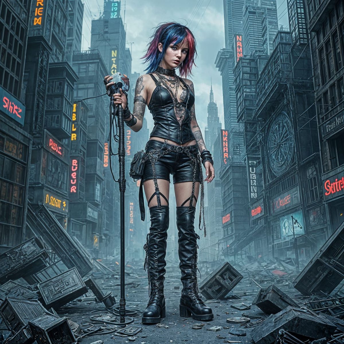 This image shows a powerful goth woman standing strong amidst a decaying cyberpunk cityscape, surrounded by neon lights and dark technology, her colorful hair and bold fashion a striking contrast to the gritty urban backdrop.