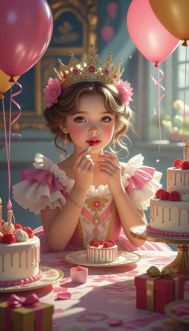 This image shows a young girl with a crown and colorful dress putting on lipstick at her birthday. The scene features presents, balloons, and cake, set in dynamic, triadic colors, as digital art.