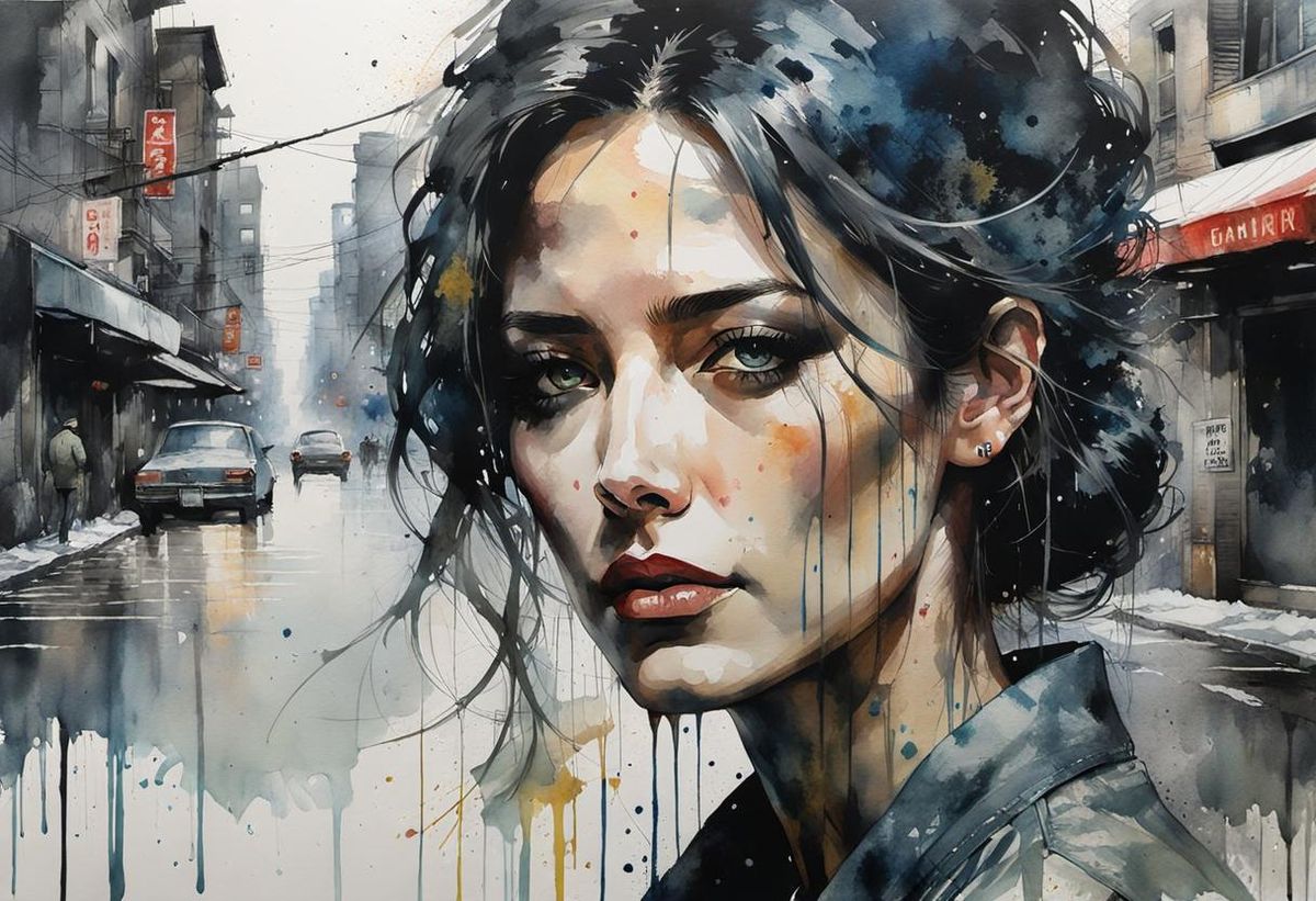 Unique beautifulsoft textured watercolor portrait of a beautiful woman in her thirties thas has just been dumped by her boyfriend. Emotions. Humanity. Big_anonymous_city_background.