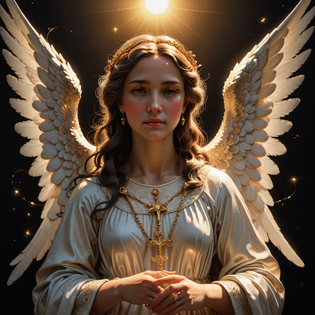 This image depicts a beautiful female angel with large white wings, surrounded by three cherubs, in a warm, sunlit scene with soft, golden light illuminating her face. Created in an oil painting style with subtle sfumato and intricate details, this digital art piece is a masterpiece of hyper-realistic, i...