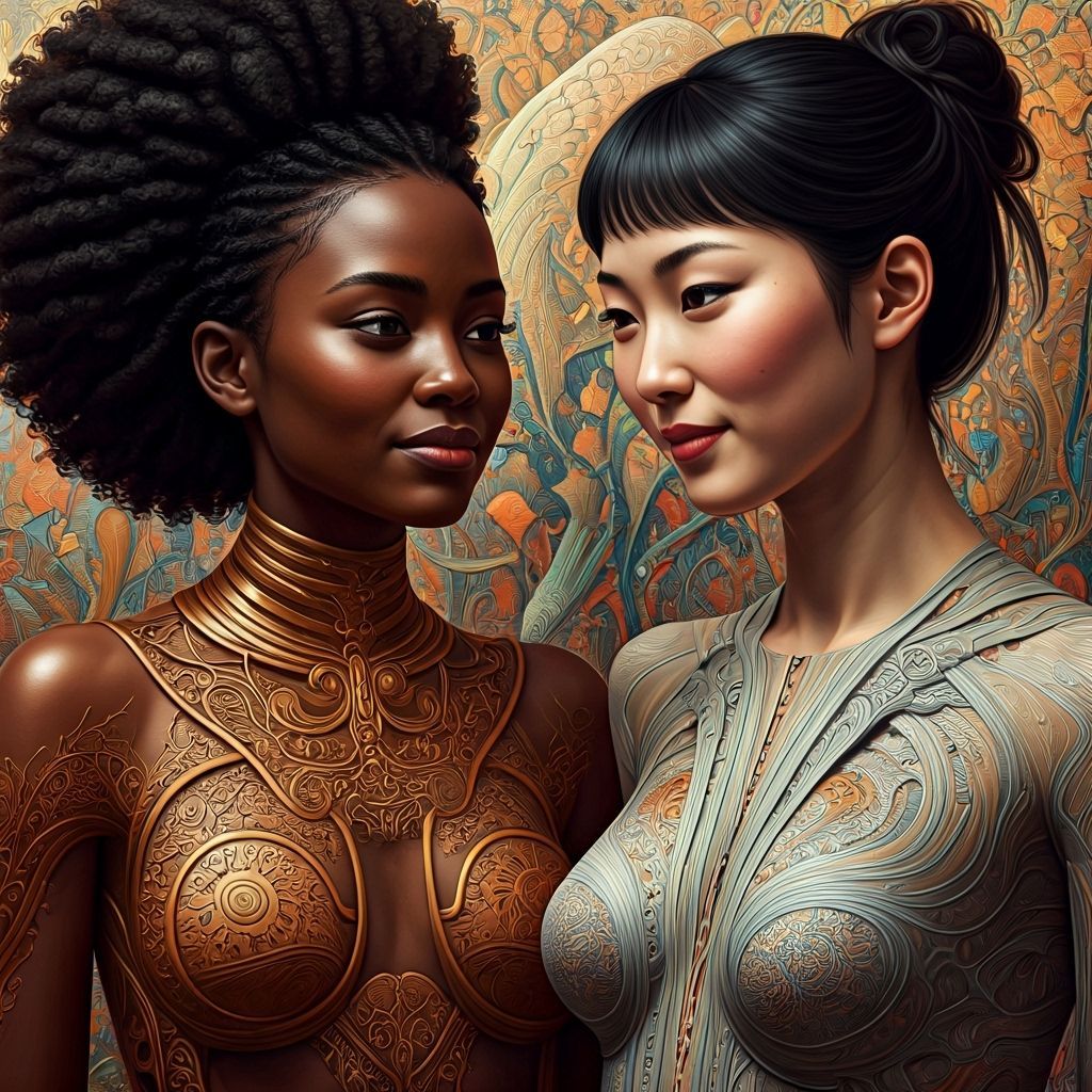 This image shows two smiling women, one with dark skin and the other with fair skin, posing in abstract clothing in a modern interior. The image is reminiscent of detailed concept art.