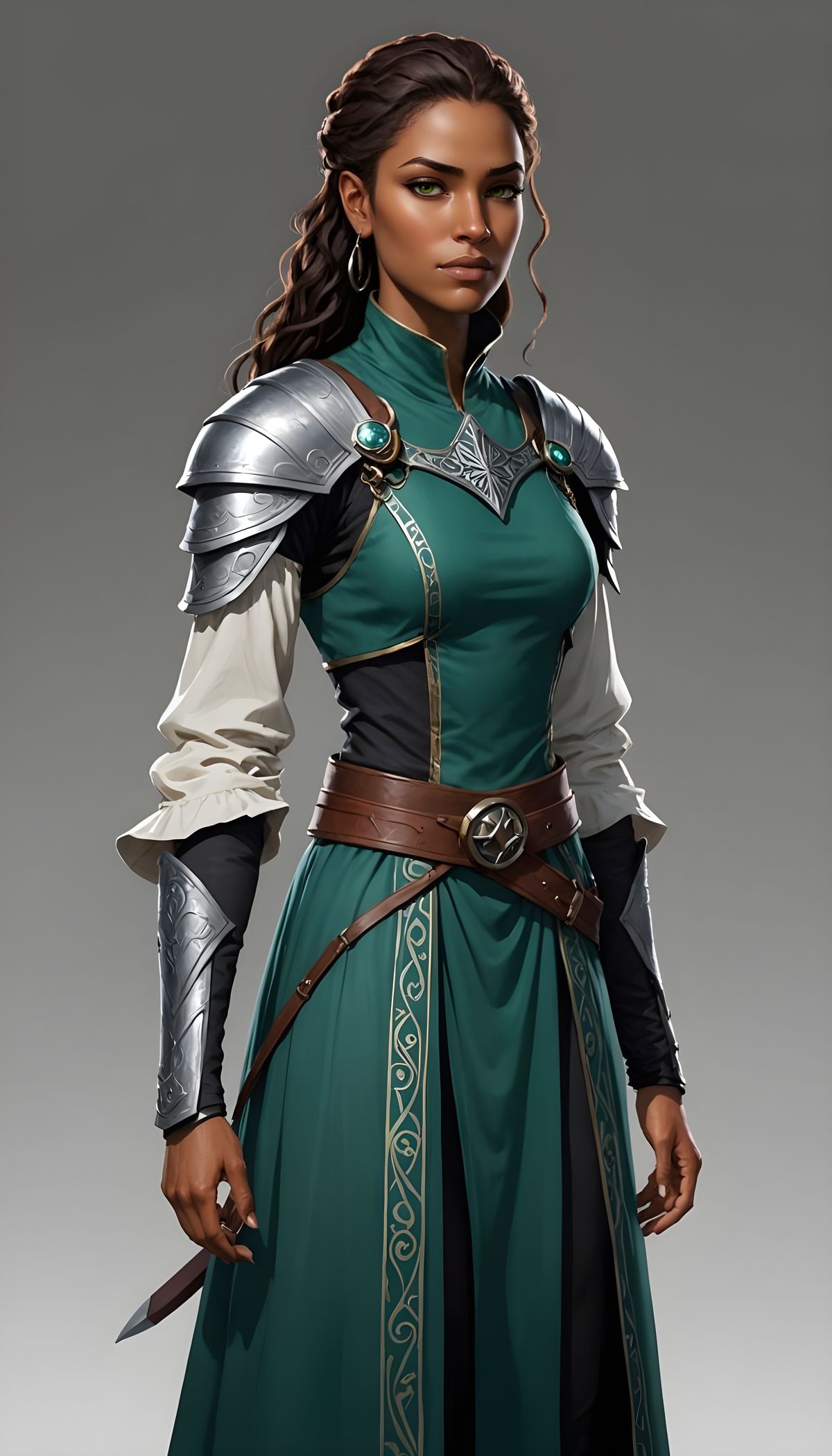 This image shows a light-brown skinned woman with light green eyes, dressed as a scribe or scholar. The design blends black and silver colors, portraying a character from a fantasy world.
