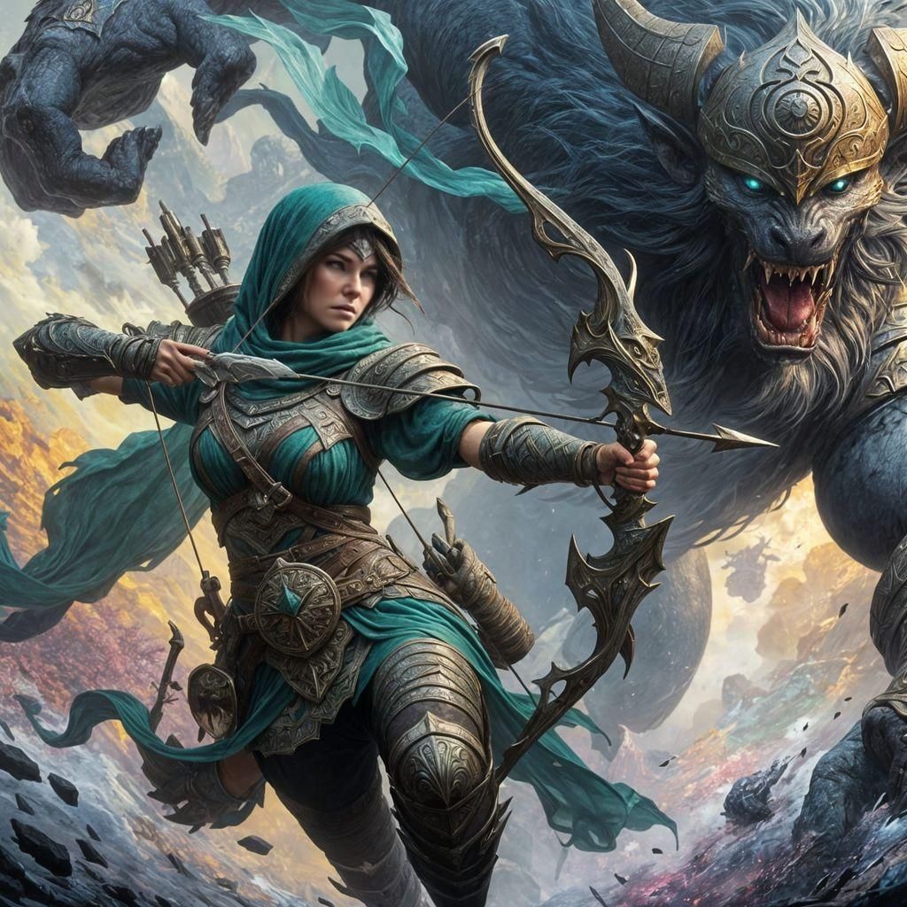 "a female hunter with her bow in hand running toward a behemoth, epic, detailed, dark green armor detailed matte painting, deep color, fantastical, intricate detail, splash screen, complementary colors, fantasy concept art, 8k resolution trending on Artstation Unreal Engine 5"