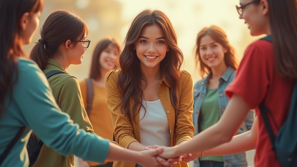 Picture of people extending a helping hand to a white university girl with brown hair and green eyes It is very beautiful