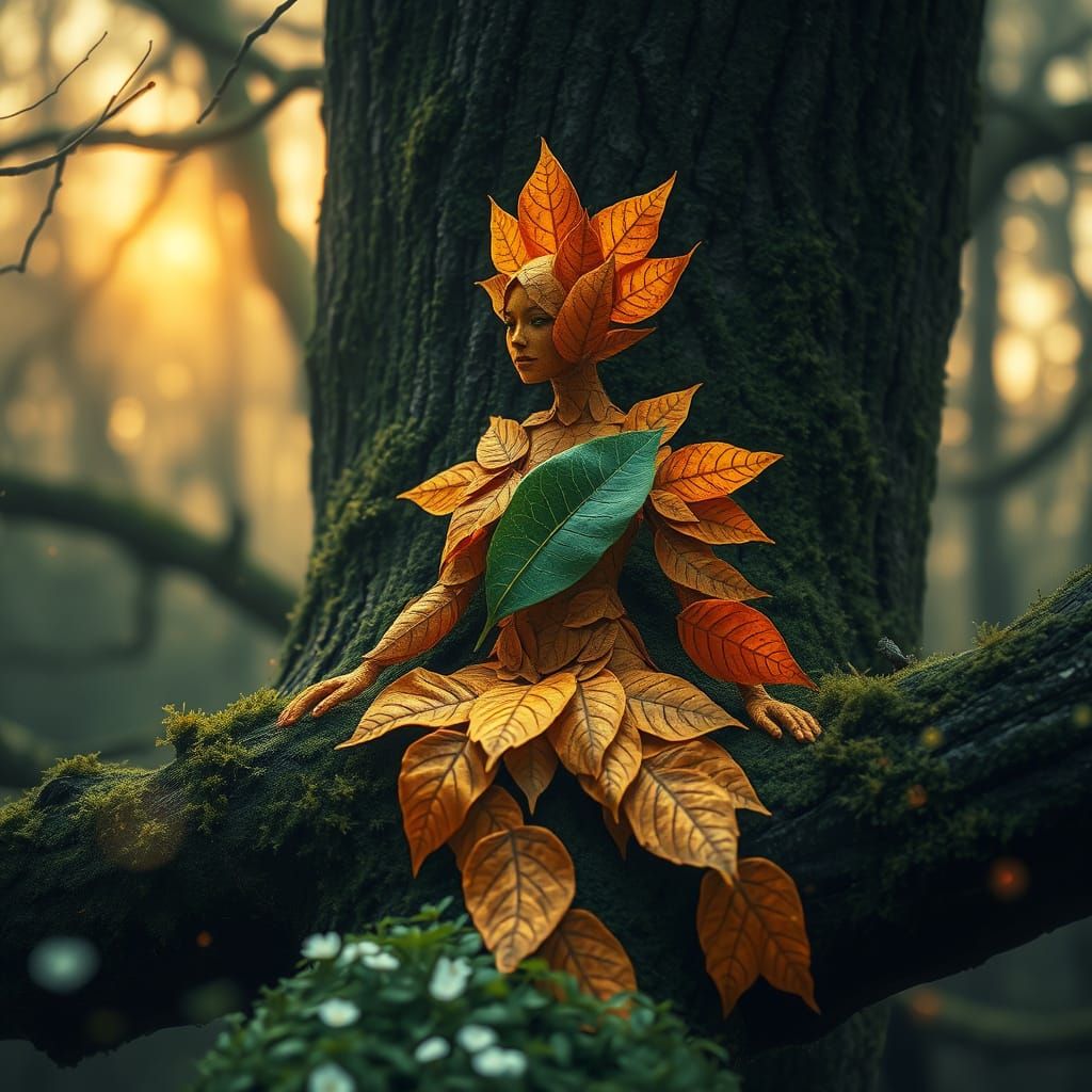This image shows a figure that resembles a woman, composed entirely of orange leaves, seated on a mossy branch in a mystical forest. Soft light filters through the trees in this digital artwork.