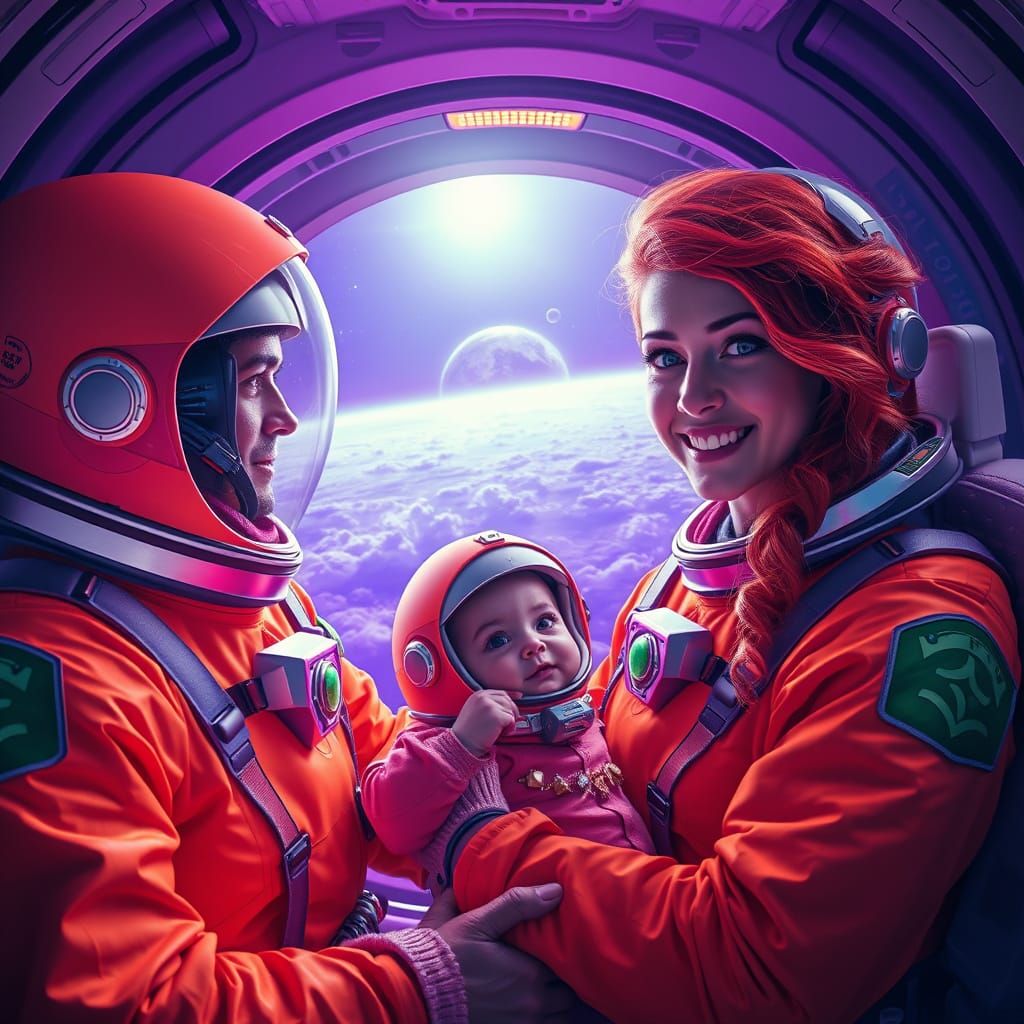 This image shows astronauts floating in space, wearing bright orange suits, with smiling faces visible through their helmets. In the distance, a space capsule with a panoramic cockpit window shows three purple planets, one with swirling violet-blue clouds, amidst a stunning purple-hued universe with star...