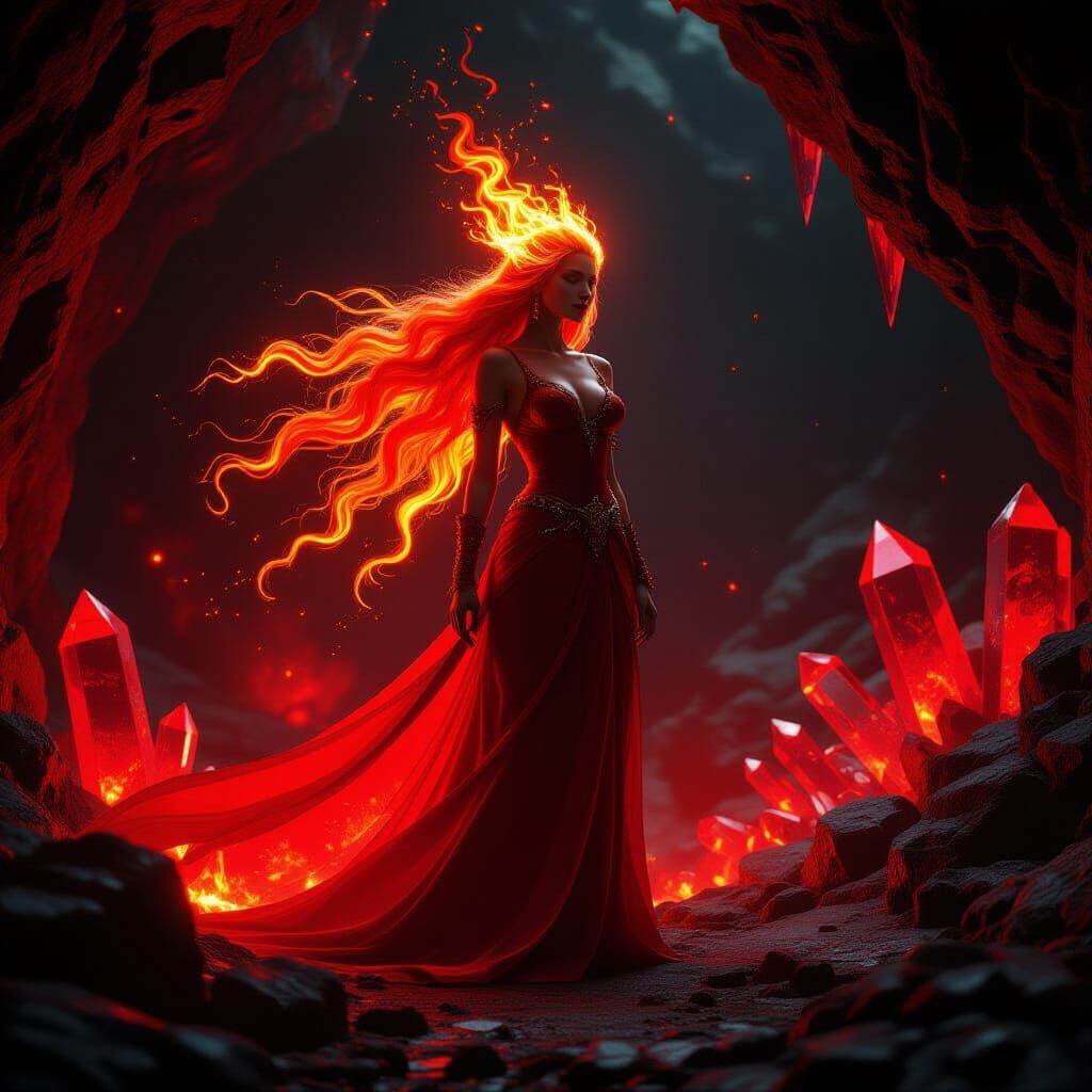 This image shows a fire goddess with blazing hair in a cavern filled with red crystals. The cinematic scene is richly colored with film grain and a vignette, creating a mystical and wondrous atmosphere.