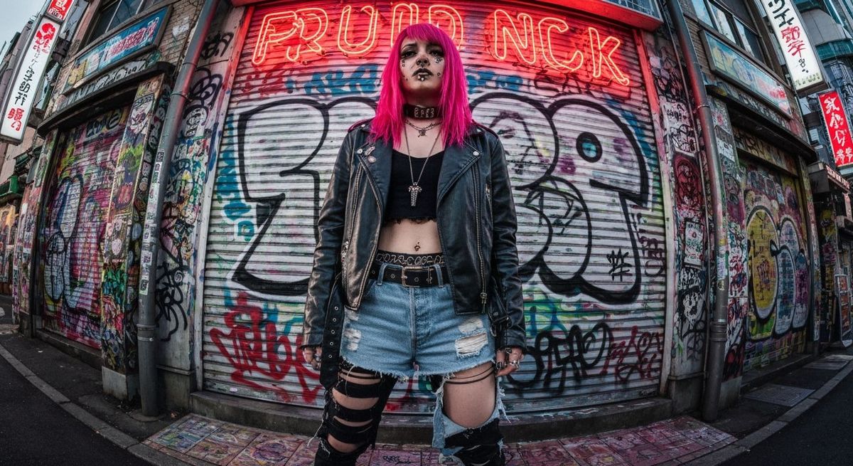 A striking picture of a punk gyaru in an urban environment. The young woman with bright pink hair and multiple piercings wears a torn leather jacket and ripped denim, capturing a rebellious punk aesthetic with Harajuku and Shibuya influences.