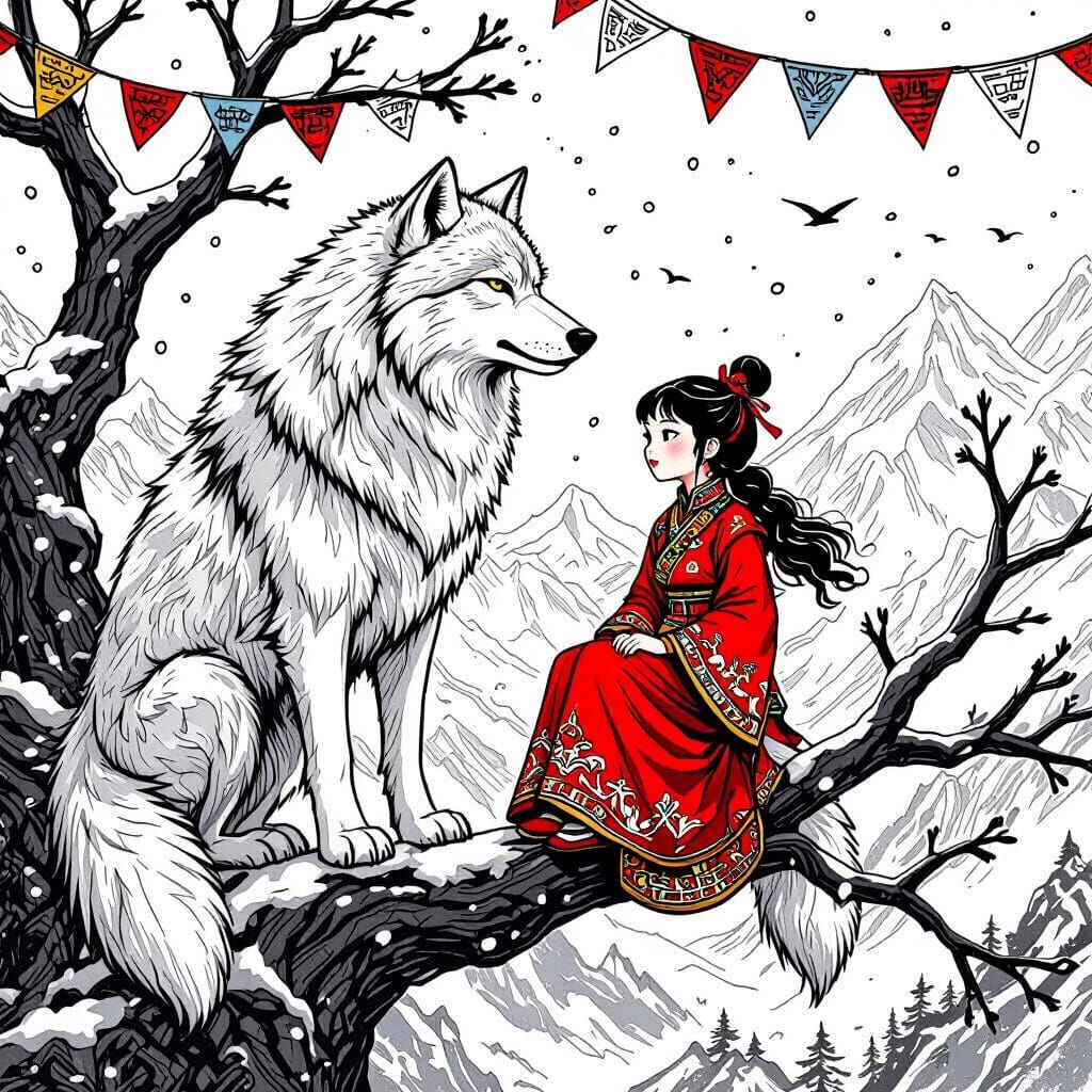 A striking black and white zentangle line art illustration of a girl in traditional Chinese dress and her white wolf guardian on a snowy mountain branch, with prayer flags overhead.