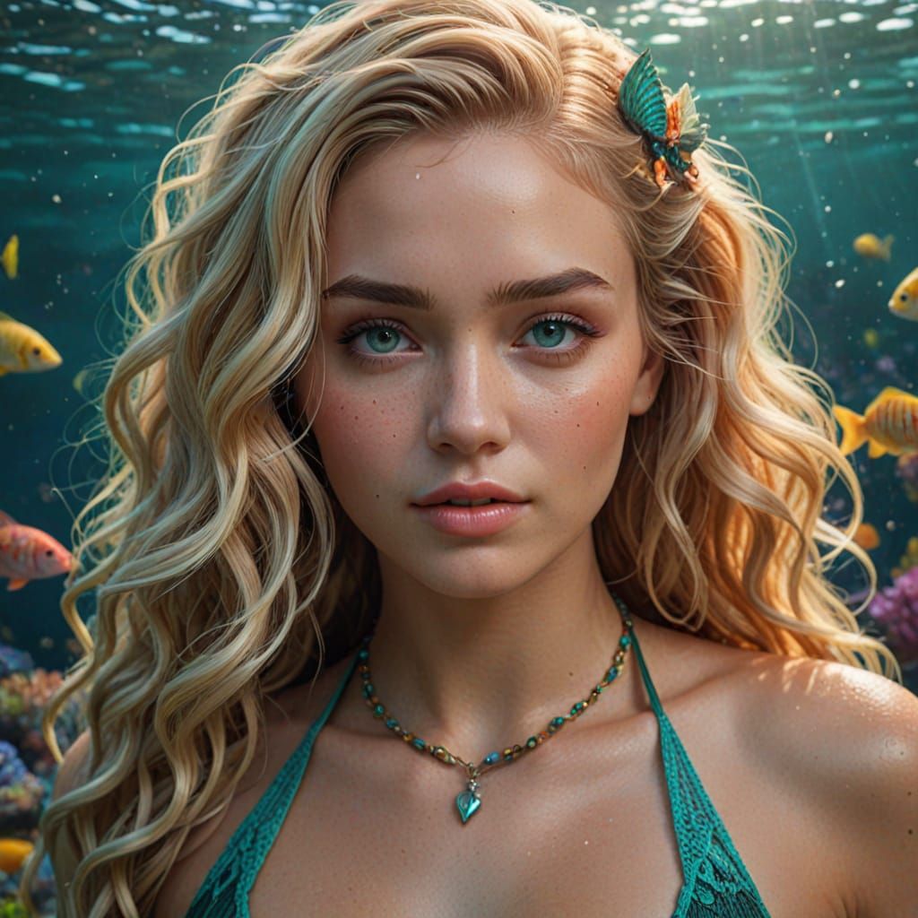 This image showcases a captivating young mermaid with vibrant blonde hair, surrounded by colorful fish and coral in a serene underwater scene, featuring intricate details and ethereal lighting.