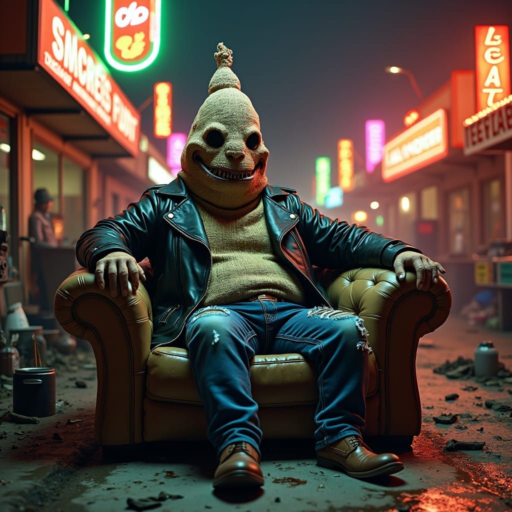 This image shows Oogie Boogie in a trailer park setting. He is depicted with a sardonic grin, wearing a faded leather jacket and ripped jeans, captured in a grimy, 90s-era animation style.