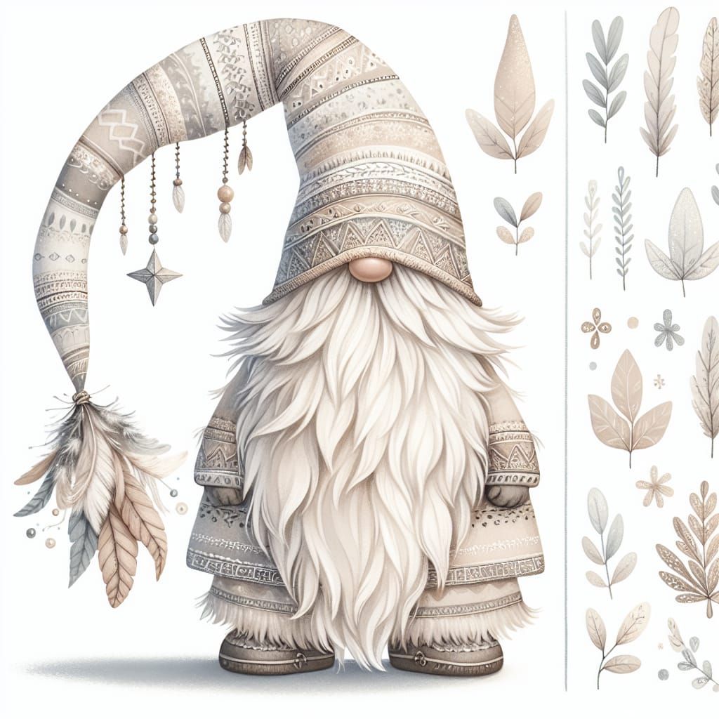 This image shows a festive Christmas gnome illustration with a long beard and pointy hat. The design incorporates boho-chic elements in soft beige, silver, and white pastel colors. The gnome has subtle Christmas details.