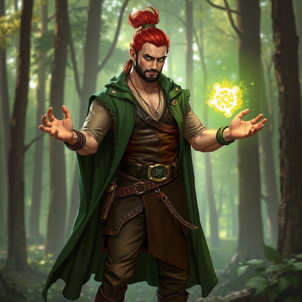 This image shows a powerful male witch surrounded by a circle of glowing green sparks in a mystical forest. He wears a green cloak, open brown leather vest, and brown leather pants, with a rugged beard and striking green eyes.