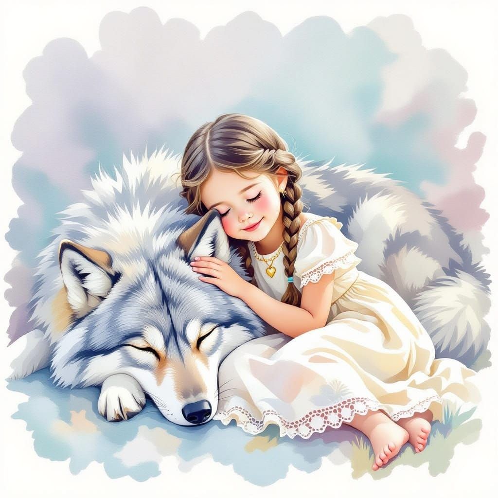 This image depicts a young girl with braids leaning against a sleeping shadow wolf, rendered in a vibrant, wet-in-wet watercolor style with soft transitions and a magical atmosphere. Floating islands and waterfalls create an enchanting background.