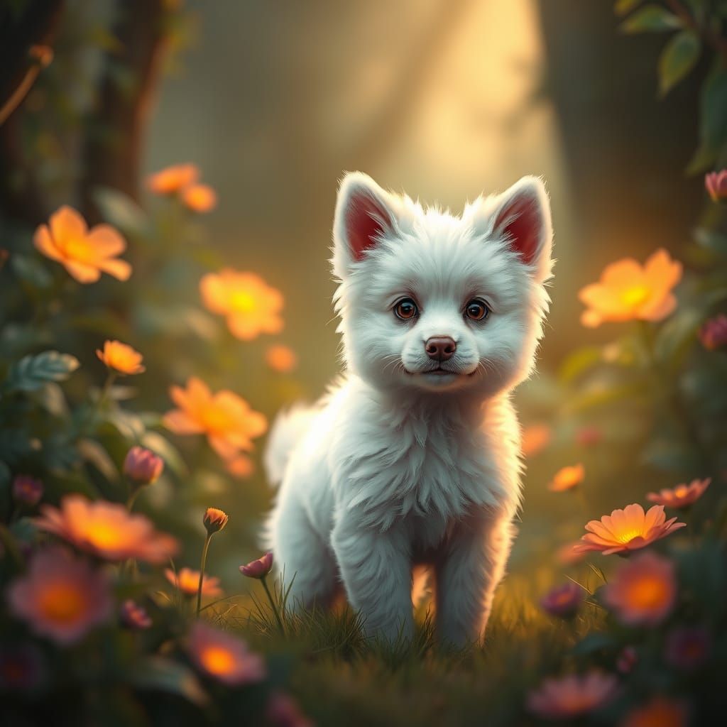 A mystical scene of a cute white dog amidst lush greenery and vibrant flowers, bathed in soft light with intricate shadows, reminiscent of fantasy art and high-detail matte paintings