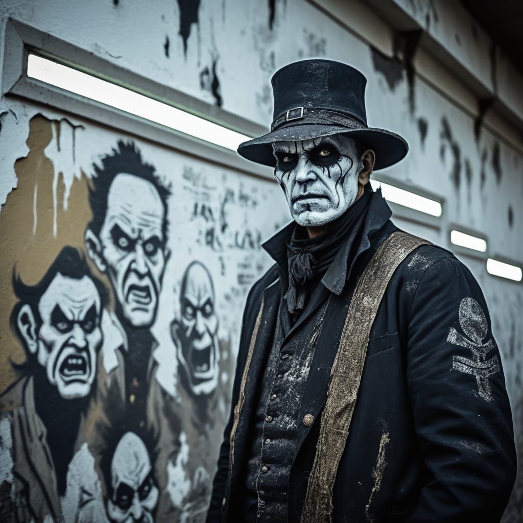This image depicts a disreputable warlock, embodying tyranny and mutation with a bold attitude. Rendered in white lead paint on a craquelure textured wall, it suggests deep-seated trouble and a hint of optimism.