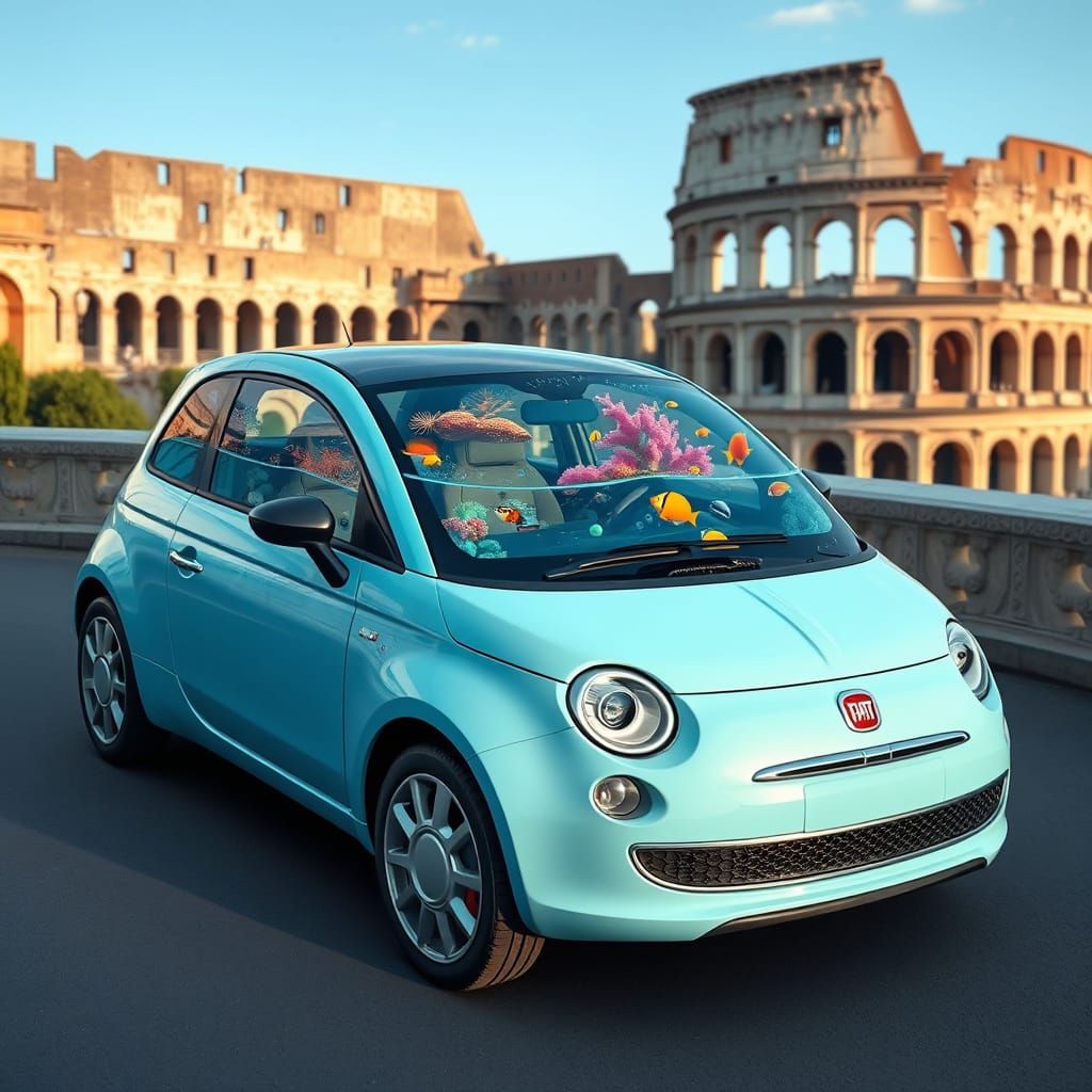 This image shows a light blue Fiat Nuova with a glass roof, repurposed as an aquarium teeming with colorful coral fish, displayed at the Colosseum in Rome, in a hyperrealistic style.