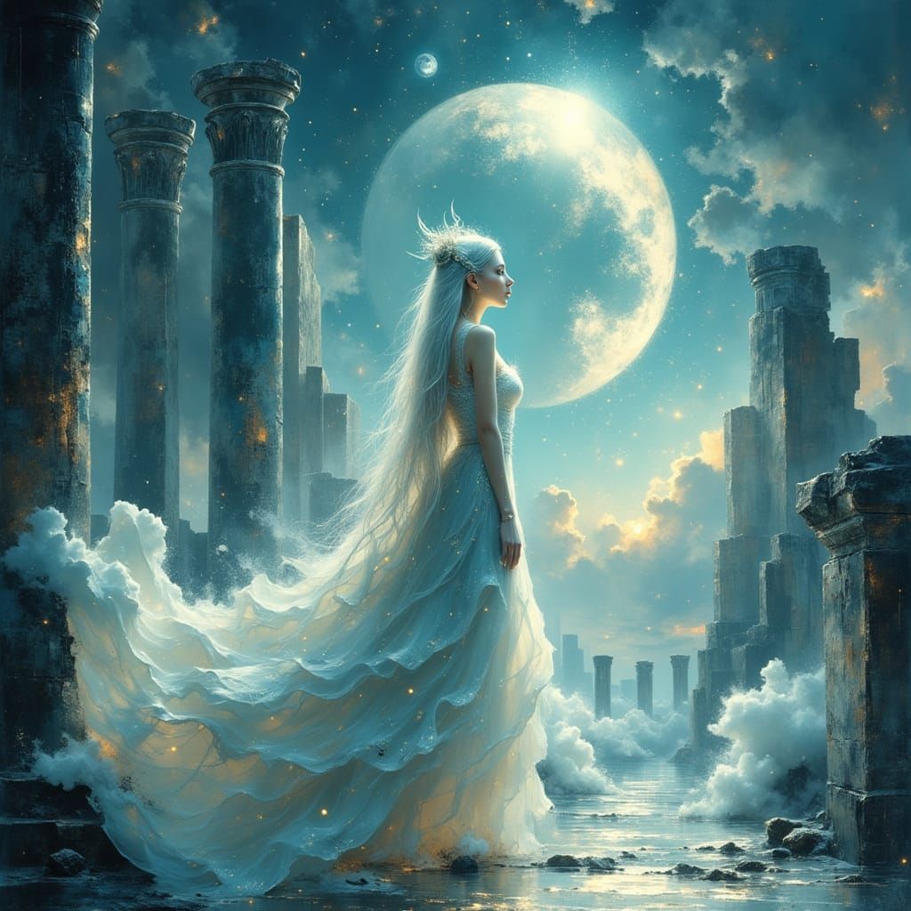 A hyperrealistic illustration of a woman with white hair and green eyes in twilight temple ruins. Her dress appears as luminescent clouds, with floating marble and statues. Soft cinematic lighting with cool tones.