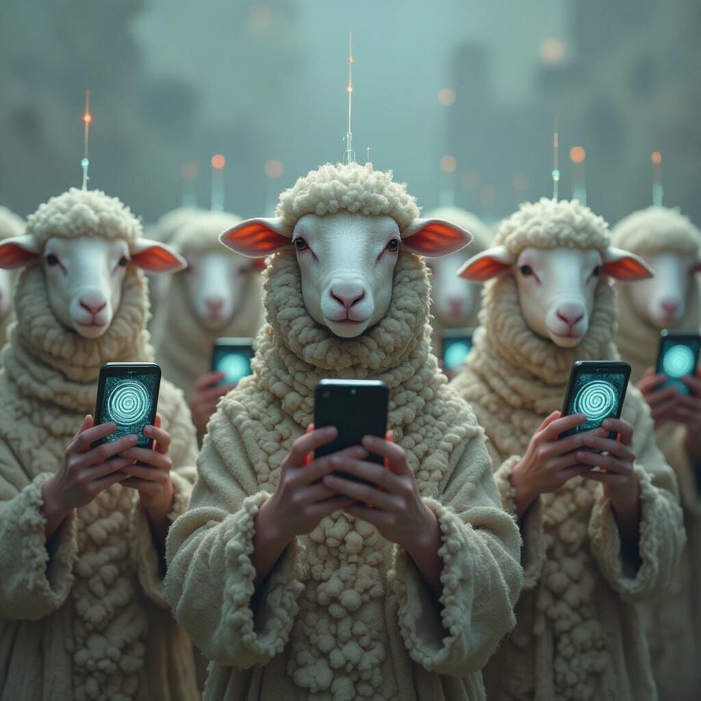 · The phones are not held naturally; they are physically attached to the users’ hands, almost like a growth or a cybernetic implant, with faint, pulsating circuitry crawling up their arms.