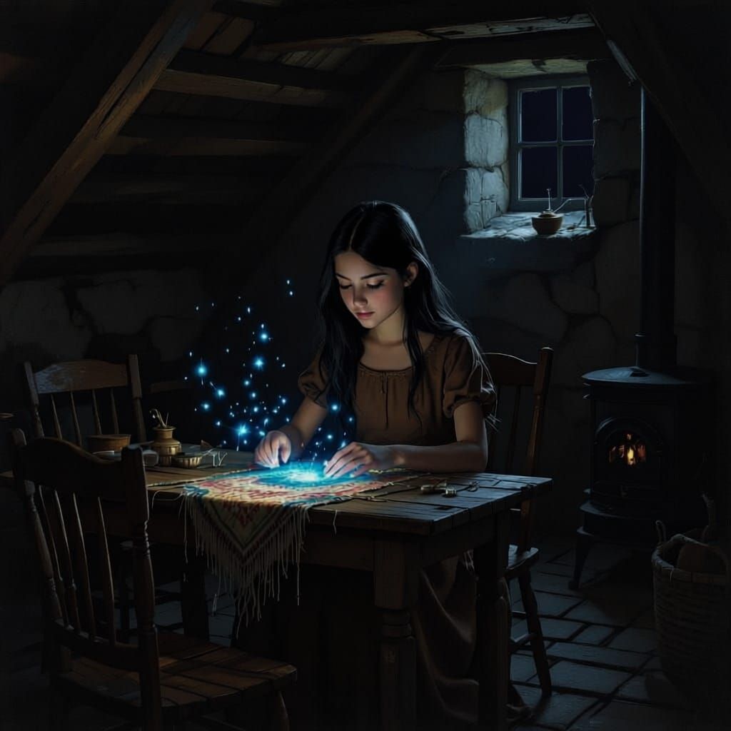 This image shows a young girl with long black hair in a brown dress, sitting in a dimly lit basement room and weaving a tapestry. Glowing blue light emanates from her fingers, creating a magical atmosphere.