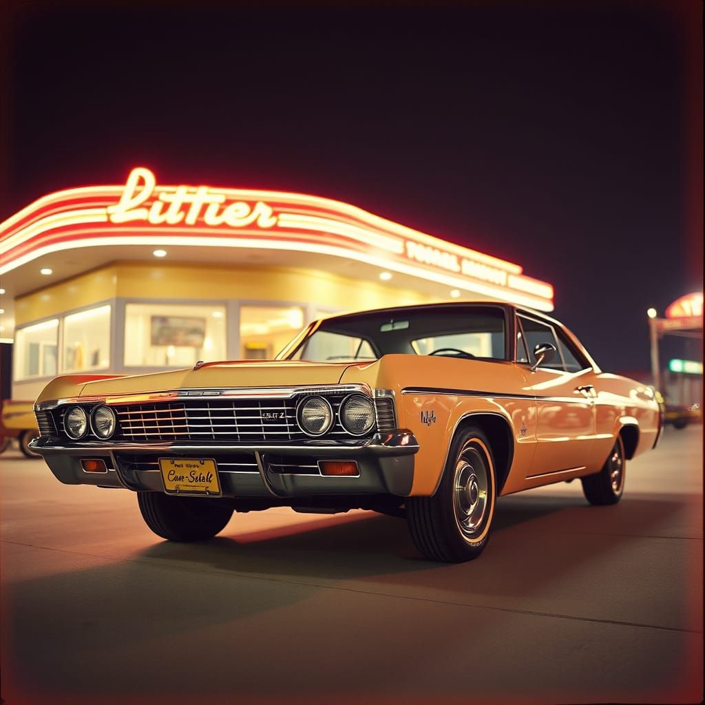 This image captures a pristine 1965 Chevrolet Impala Super Sport under bright diner lights. Presented in the style of a faded Kodachrome photo, it evokes 1960s Americana nostalgia.