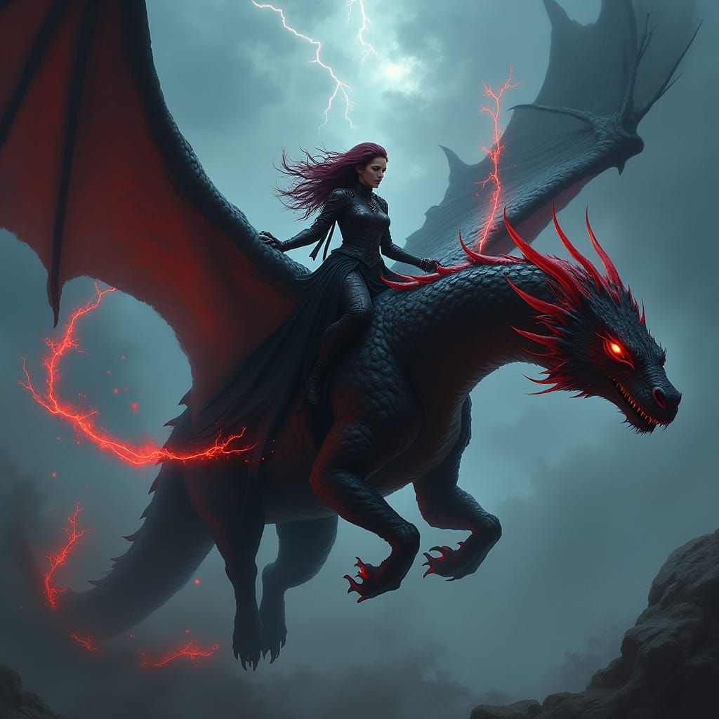 This dramatic digital painting depicts a heroic woman riding a massive black dragon through a turbulent stormy sky. The dragon's wings beat powerfully, with scales glinting in the lightning, as it prepares to strike. The artwork blends gritty realism with fantastical elements in a cyberpunk aesthetic.