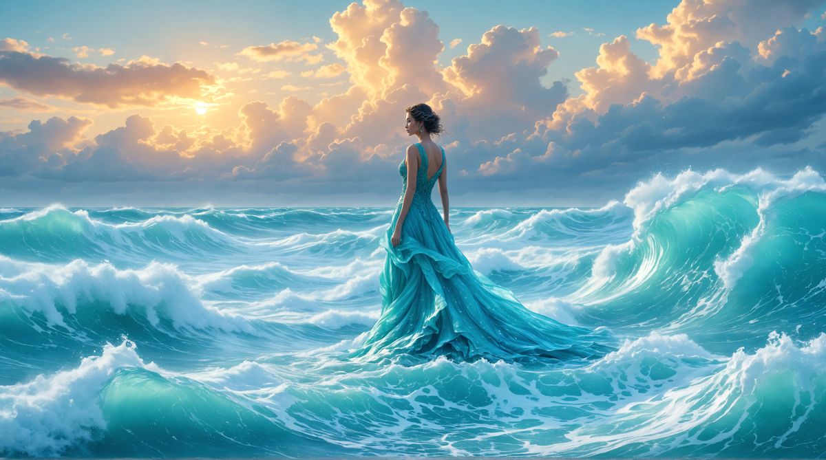 This image shows a woman in an elaborate gown standing in the sea at sunrise. The dress is designed like swirling water and seafoam, blending into the turbulent turquoise waves under an illuminated sky. Epic fantasy illustration.