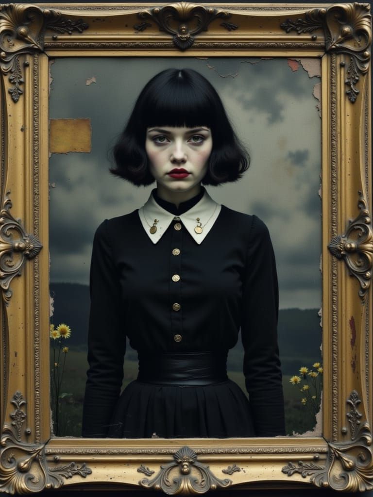 A striking picture of a goth girl in black attire with pale skin and dark makeup, framed against a dark, atmospheric backdrop. The image evokes delicate lines in a moody atmosphere.
