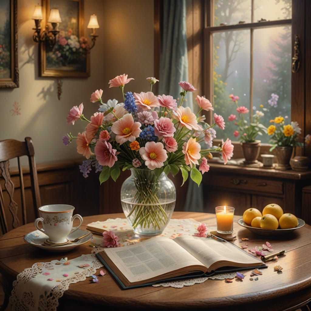 This image shows a soft, warm, and inviting still life scene with delicate flowers on a vintage wooden table, set in a misty, serene atmosphere with intricate details and a gentle, peaceful ambiance.