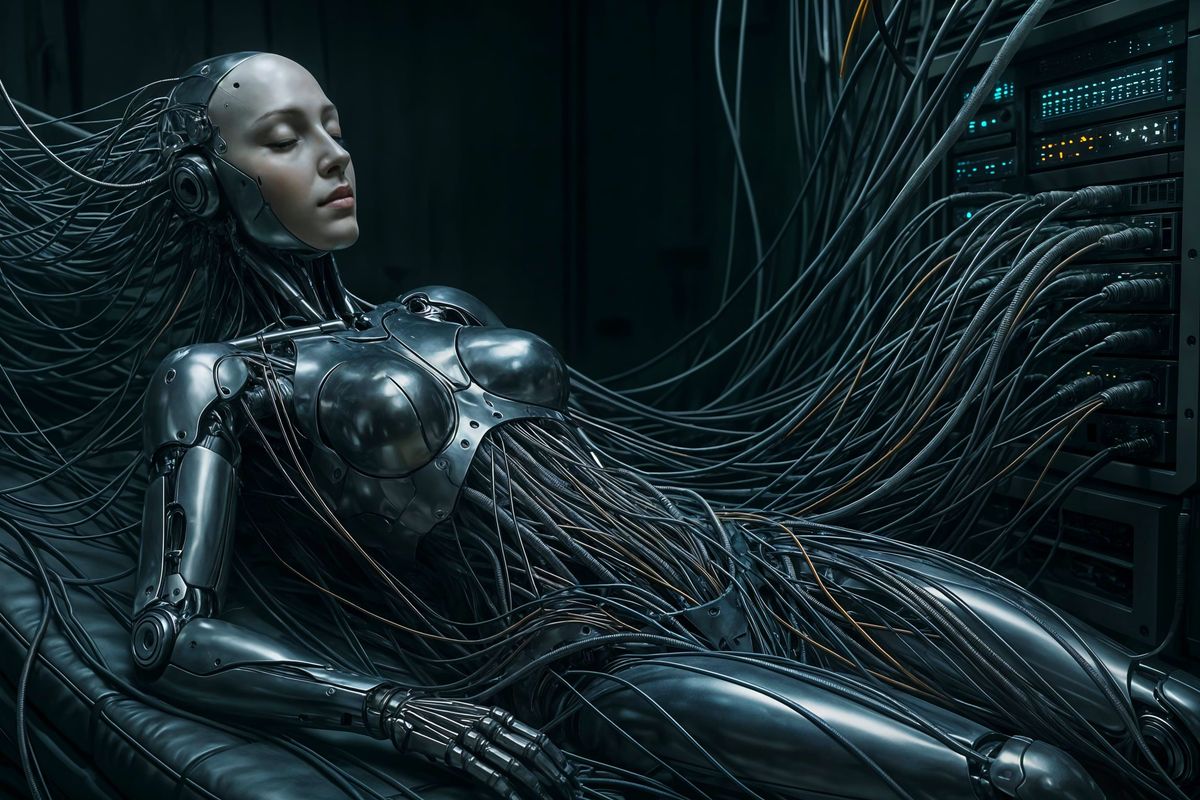 This image shows a hyperrealistic female humanoid robot resting in a lab. Intricate wires connect her to a glowing computer console, highlighting the advanced technology in a softly lit, quiet and technical environment.