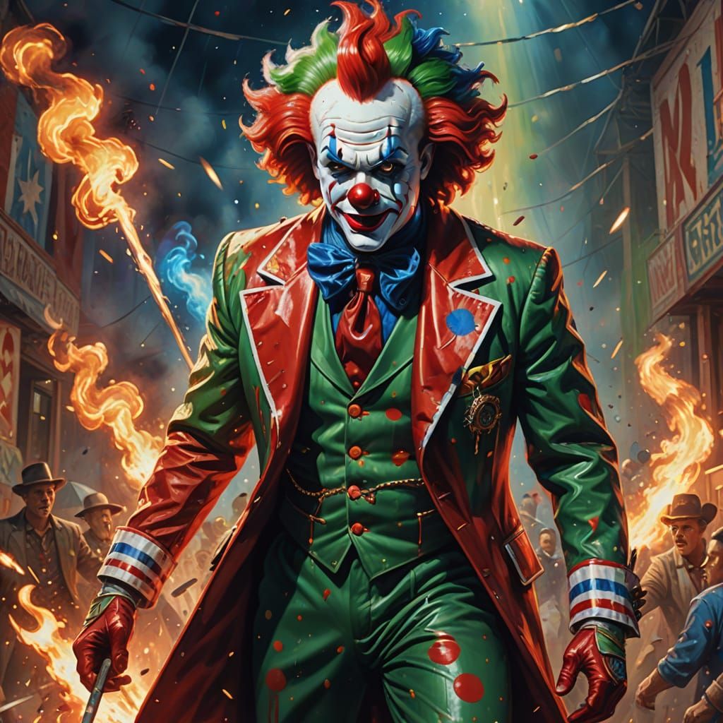 This image showcases a clown warrior in a striking red, white, and green zoot suit, sporting a blue slicked-back haircut. Rendered as a vibrant oil painting with dramatic lighting, it captures an action-packed circus aesthetic.