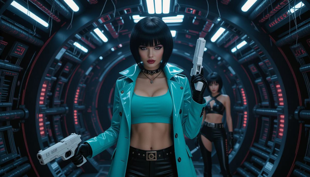A biomechanical woman pirate with purple eyes stands in a dark, sci-fi starship hall. The scene blends anime and realistic styles with HR Giger-inspired details.