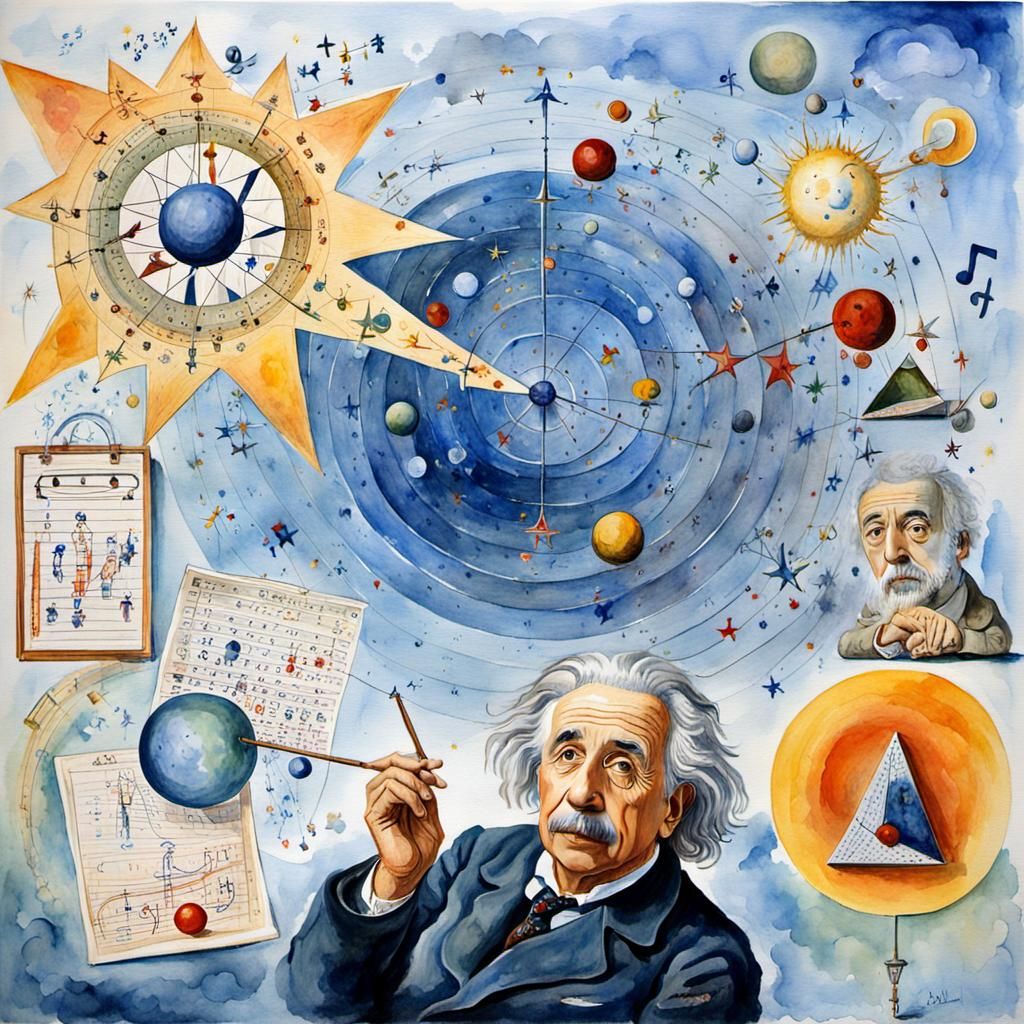 This image shows Albert Einstein in a surreal and imaginative watercolor portrait, capturing his genius with whimsy. Scientific symbols and equations surround him in a dreamlike fashion, reminiscent of surrealist art.