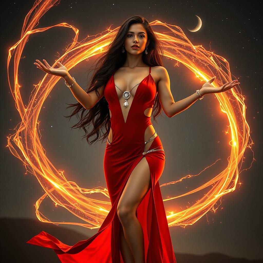 This image showcases a striking Latina woman commanding fiery energy. She is wearing a flowing red gown with futuristic metallic accents, set against a dark, starry night sky. The scene has a photorealistic, ethereal aesthetic.