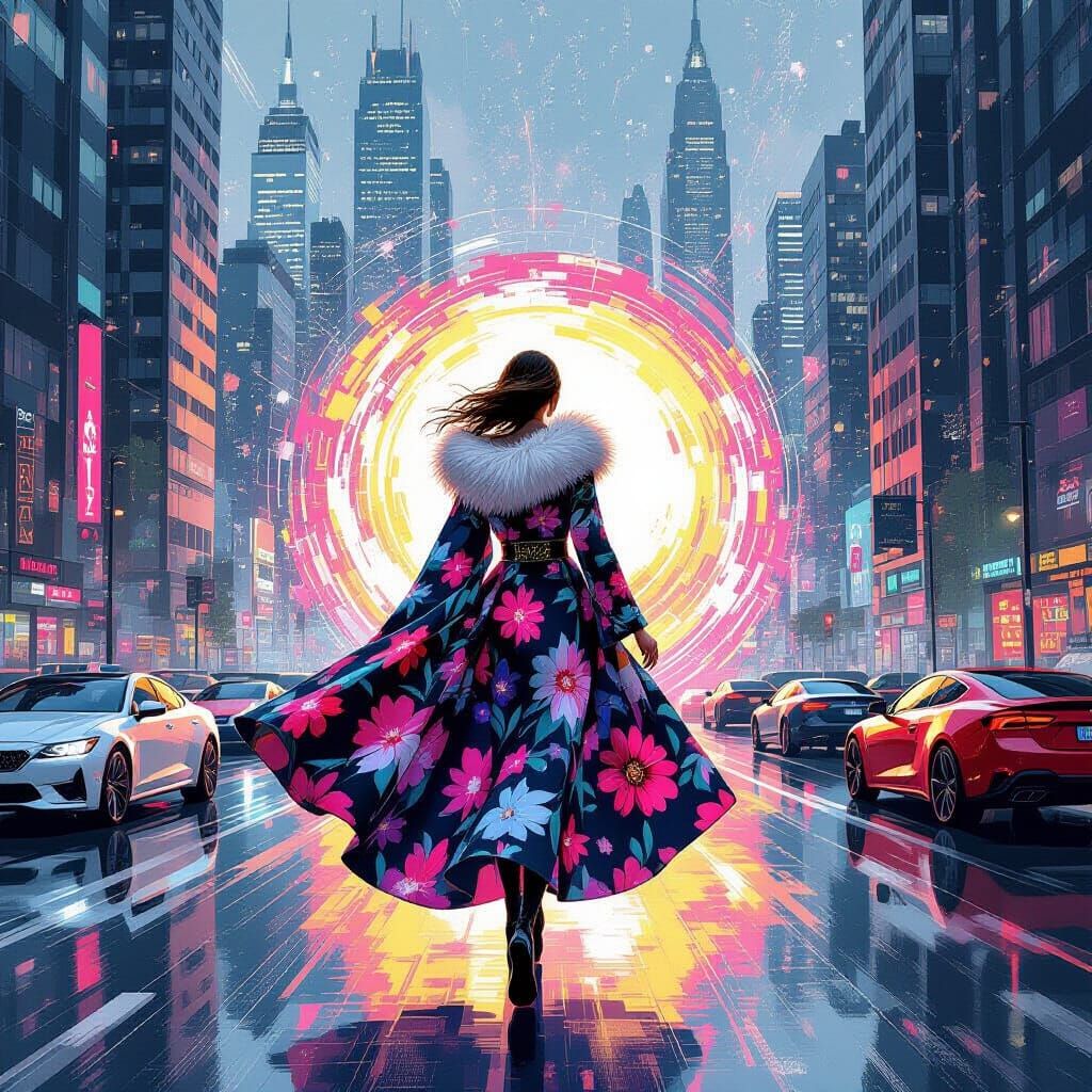 A striking picture of an elegant woman in a floral dress and cape leaving a modern city. The scene blends graffiti art, splash art, and street art styles with vivid colors and high contrast.