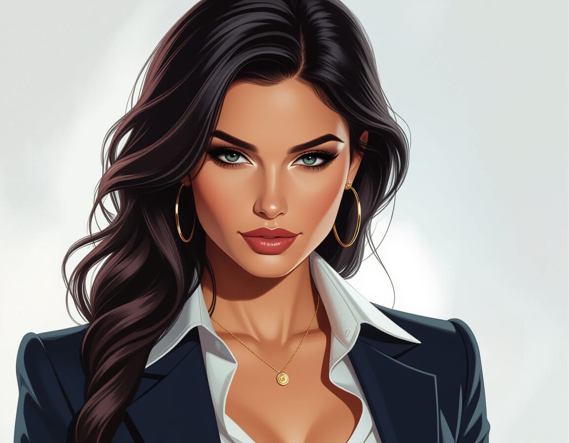 A striking picture of a dark-haired woman as a private investigator. The digital artwork features intricate details, rich colors, and a fantastical concept in 8k resolution.