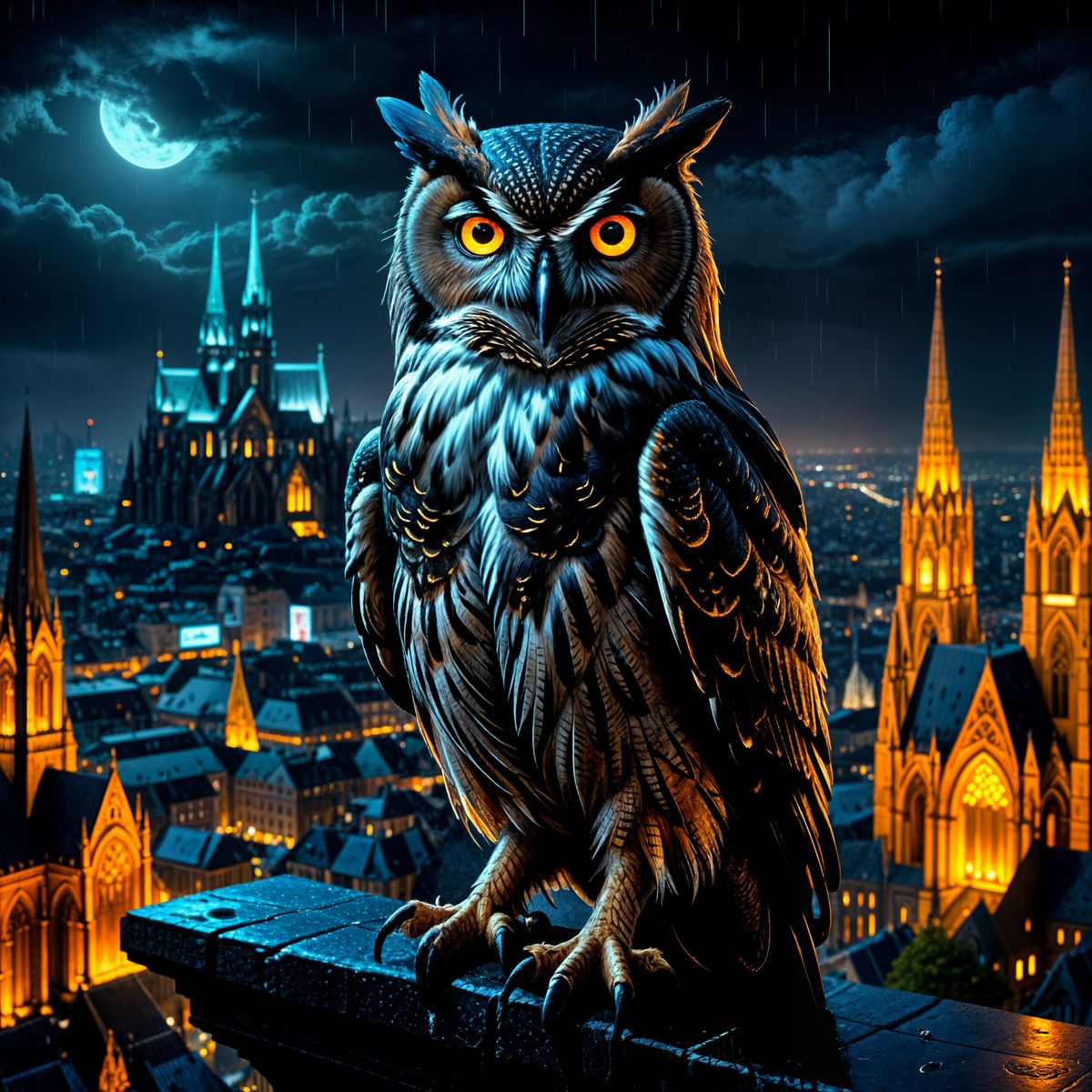 A hyperrealistic image shows a neon-eyed owl perched on a gothic cathedral at night. Rain reflects the city lights, creating a cinematic and ethereal scene in a Syd Mead and Simon Stalenhag inspired style.
