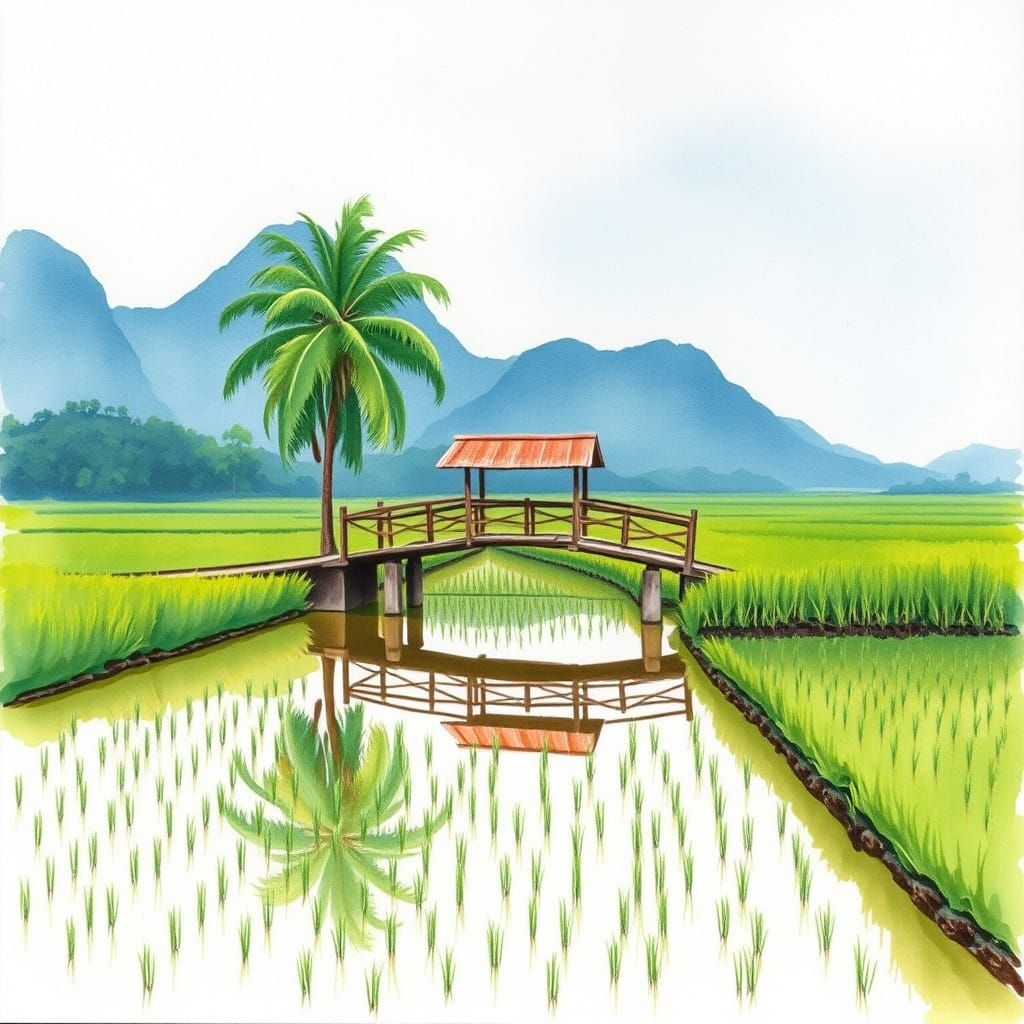 This image shows a serene watercolor painting of a bridge connecting lush rice paddies in rural Vietnam, evoking a sense of peaceful tranquility.
